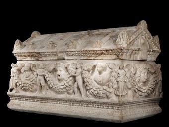 Keywords: Roman - Garland Sarcophagus - Walters 2329 - Three Quarter Left.jpg Unlike many sarcophagi this one is carved on all four sides in high relief Garlands held by winged goddesses or personifications on the corners and Eros Cupid figures on the sides support the busts of a crowned deity left and a young girl right The sarcophagus was probably intended for her In the center on both the front and back is a theatrical mask-on this side Tragedy on the other Comedy Medusa heads decorate the ends The lid takes the form of a temple roof with a pediment triangular gable at each end This sarcophagus can be traced to a particular workshop active near the ancient quarry of Dokimeion in Phrygia in Asia Minor Its discovery in Rome illustrates the long-distance trade in even very large heavy luxury goods that took place at the height of the Roman Empire between 150 180 Imperial Dokimeion marble cm 83 5 143 35 69 85 accession number 23 29 30186 Excavated from the so-called Licinian tomb Rome 1885 Don Marcello Massarenti Collection Rome 1885 by excavation Henry Walters city Baltimore Walters Art Museum Henry Walters Acquired by Henry Walters with the Massarenti Collection 1902 Treasures of Heaven The Cleveland Museum of Art Cleveland; The Walters Art Museum Baltimore; The British Museum London 2010-2011 place of origin Phrygia in present-day Turkey Walters Art Museum license Ancient Roman art in the Walters Art Museum Media contributed by the Walters Art Museum needs category review Sculptures of Greek and Roman theater masks Garland Sarcophagus Greek and Roman theater masks in 2nd century AD Garland Sarcophagus |