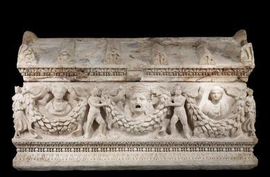 Keywords: Roman - Garland Sarcophagus - Walters 2329.jpg Unlike many sarcophagi this one is carved on all four sides in high relief Garlands held by winged goddesses or personifications on the corners and Eros Cupid figures on the sides support the busts of a crowned deity left and a young girl right The sarcophagus was probably intended for her In the center on both the front and back is a theatrical mask-on this side Tragedy on the other Comedy Medusa heads decorate the ends The lid takes the form of a temple roof with a pediment triangular gable at each end This sarcophagus can be traced to a particular workshop active near the ancient quarry of Dokimeion in Phrygia in Asia Minor Its discovery in Rome illustrates the long-distance trade in even very large heavy luxury goods that took place at the height of the Roman Empire between 150 180 Imperial Dokimeion marble cm 83 5 143 35 69 85 accession number 23 29 30186 Excavated from the so-called Licinian tomb Rome 1885 Don Marcello Massarenti Collection Rome 1885 by excavation Henry Walters city Baltimore Walters Art Museum Henry Walters Acquired by Henry Walters with the Massarenti Collection 1902 Treasures of Heaven The Cleveland Museum of Art Cleveland; The Walters Art Museum Baltimore; The British Museum London 2010-2011 place of origin Phrygia in present-day Turkey Walters Art Museum license Ancient Roman art in the Walters Art Museum Ancient Roman sarcophagi Cupids in ancient Roman art Media contributed by the Walters Art Museum needs category review Sculptures of Greek and Roman theater masks Garland Sarcophagus Greek and Roman theater masks in 2nd century AD Garland Sarcophagus |