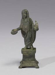 | Keywords: Roman - Sacrificing Priest - Walters 54752.jpg Each Roman household had a lararium or household shrine in which small bronze figurines of deities including lares the divinities protecting the house were displayed The master of the house would make daily offerings at the shrine as well as more ceremonial offerings on important occasions This small figurine was found together with five others Walters 54 751 54 748 54 750 54 2290 and 54 749 in a lararium at Boscoreale the site of a Roman villa near Pompeii This Genius or priest stood before the household deities Isis-Fortuna Mercury a seated Jupiter Alexander Helios and a standing Jupiter These were divinities the family particularly venerated for the continuing good fortune of the household century 1 cast bronze with base cm 8 64 4 23 3 accession number 54 752 29743 De Prisco Boscoreale/Canessa 1906 by excavation Henry Walters Baltimore 1906 mode of acquisition unknown Walters Art Museum Henry Walters Acquired by Henry Walters 1906 Pompeii and The Roman Villa National Gallery of Art Washington; Los Angeles County Museum of Art Los Angeles 2008-2009 place of origin Roman Empire Walters Art Museum license Ancient Roman bronze statuettes from Boscoreale in the Walters Art Museum Media contributed by the Walters Art Museum needs category review |