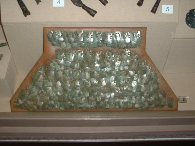 Keywords: Roman scale armour fragment.JPG Photograph was taken in the Somerset County Museum in Taunton on 29-Oct-05 2005-04-01 own assumed Gaius Cornelius low quality Bronze armour Lorica squamata Somerset County Museum