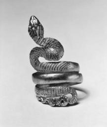 | Keywords: Roman - Snake Ring - Walters 571539.jpg The inner face of the gold ring is flat allowing it to fit snugly against the finger; the outer face is slightly convex The snake's skin is rendered at head and tail by curving rows of short strokes Broader strokes mark features along the side of the head and at the very tip of the tail The eyes are hollowed as if once inlaid with colored glass century 1 BC - century 1 AD gold cm 2 2 1 3 7 accession number 57 1539 31414 Michel Abemayor Cairo date and mode of acquisition unknown Henry Walters city Baltimore Walters Art Museum Henry Walters Acquired by Henry Walters 1930 Jewelry - Ancient to Modern The Walters Art Gallery Baltimore 1979-1980 Beyond the Pharaohs Egypt and the Copts in the Second to Seventh Centuries A D Museum of Art Rhode Island School of Design Providence; The Walters Art Gallery Baltimore 1989 place of origin Roman Empire Walters Art Museum license Ancient Roman art in the Walters Art Museum Jewellery in the Walters Art Museum Snakes in art Ancient Roman snake jewellery Ancient Roman rings |