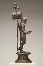 | Keywords: Roman - Sucellus - Walters 54998 - Right Side.jpg Sucellus Sucellus was a major Gaulish deity associated with the underworld whose attributes include his wolf-skin garment a mallet or hammer now missing from his upraised hand and a small jar called an olla This statuette is the earliest and finest of any known Sucellus image The portrayal is reminiscent of Classical Greek style and he resembles the Greek hero Heracles Behind him like a symbol of worship appears an oversized mallet with five smaller mallets radiating from it The statuette was excavated from the lararium household shrine of a Roman house in France century 1 2 bronze with base cm 32 15 5 12 3 accession number 54 998 20962 ProvenanceEvent 1866 discovery Lararium of a house in Vienne France Wills Collection Sale 1894 John Edward Taylor 1894 by purchase Taylor Collection sale 1912 Henry Walters city Baltimore Walters Art Museum Henry Walters Acquired by Henry Walters 1912 Vive la France French Treasures from the Middle Ages to Monet cite book D K Hill Catalogue of Classical Bronze Sculpture in the Walters Art Gallery Baltimore Trustees of the Walters Art Gallery 1949 Bronzes grecs et romains recherches récentes 00654643 cite journal D K Hill Le Dieu au maillet de Vienne à la Walters Art Gallery de Baltimore cite book Annemarie Kaufmann-Heinimann Ikonographie und Stil Zu Tracht und Ausstattung einheimischer Gottheiten in den Nordwestprovinzen 2012 Martine Denoyelle Sophie Descamps-Lequime Benoît Mille et Stéphane Verger Bronzes grecs et romains recherches récentes http //inha revues org/3964 Gallia 11 1953 fr 205-220 Walters Art Museum license Ancient Roman sculptures in the Walters Art Museum Sucellus Vive la France French Treasures from the Middle Ages to Monet |