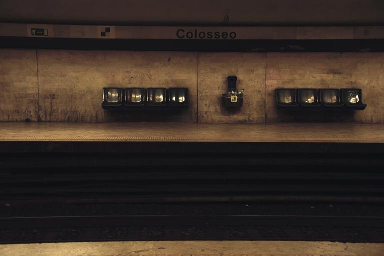 Keywords: rome colosseum metro morning solitude waiting chairs trash tracks