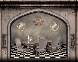 Keywords: room dining table chairs meal dinner party gray slate stone gothic arch tile floor chandelier mirrors bottle goblet interior furniture decor indoors residence furnishings