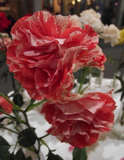 Keywords: Rosatigertail.jpg en Rosa 'Tiger Tail' at the San Diego County Fair California USA Identified by exhibitor's sign own Stickpen 2010-06-16 public domain Rosa Floribunda Group Rosa cultivars T Striped roses Pale pink and red roses
