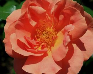 Keywords: rose bloom bud flower apricot pink-orange petals soft velvety beautiful centre yellow stamen garden