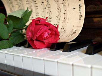 Keywords: rose red sheet music piano old vintage antique white black petals leaves green flower blossom color elegant leaf single stem decoration bloom floral passion music musical musician pianist notes keys keyboard classical