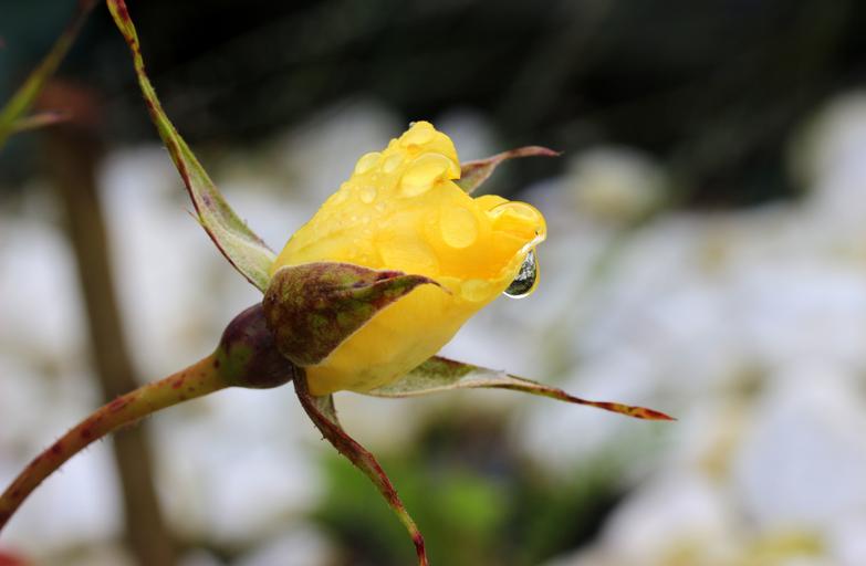 Keywords: rosebud rose bud blossom bloom yellow raindrop drip wet drop of water beaded nature