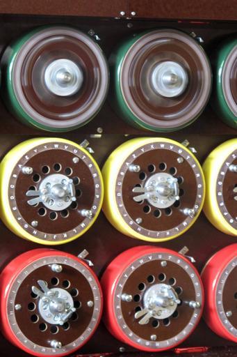 | Keywords: Rotating upper bombe drum.jpg en Drums on the rebuilt Bombe in action The upper 'fast' drum corresponds to the left-hand Enigma rotor No III the middle to the middle rotor No IV and the bottom one to the right hand rotor No I My own photograph TedColes 2011-04-10 Cc-zero Bletchley Park Bombe |