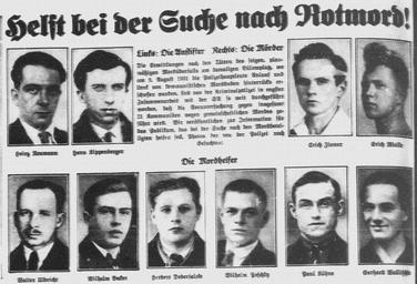 Keywords: Rotmord.jpg Fahndungsplakat der Berliner Polizei vom September 1933 Bildunterschriften von links oben nach rechts unten Heinz Neumann Hans Kippenberger; Erich Ziemer Erich Mielke; Walter Ulbricht Wilhelm Becker Herbert Dobersalzke Wilhelm Peschky Paul Kähne Gerhard Wallitschke Text <pre>Helft bei der Suche nach Rotmord Links Die Anstifter Rechts Die Mörder Die Ermittlungen nach den Tätern des feigen plan- mäßigen Mordüberfalls am damaligen Bülowplatz wo am 9 August 1931 die Polizeihauptleute Anlauf und Lenk von kommunistischen Mordbuben hinterrücks er- schossen wurden sind von der Kriminalpolizei in engster Zusammenarbeit mit der SA so weit durchgeführt worden daß die Voruntersuchung gegen insgesamt 21 Kommunisten wegen gemeinschaftlichen Mordes ge- führt wird Wir veröffentlichen zur Information für das Publikum das bei der Suche nach den Mordbetei- ligten helfen soll Photos der von der Polizei noch Gesuchten </pre> en Red Murderers - Wanted Poster published by the Berlin Police in September of 1933 announcing that warrants of arrest have been issued for ten people for the killing of two Police Officers in 1931 Pictures of the alleged perpetrators and displayed on the poster Among them are the former Communist Reichstag Deputies Hans Kippenberger and Walter Ulbrich as well as Erich Mielke who later became the head of the Ministerium für Staatssicherheit the East German secret service Berlin Document Centre Berlin Police Publicly displayed Wanted Poster Published in 1933 based on older Mug Shots from Police Records PD-old PD-old Erich Mielke Walter Ulbricht 1933 in Berlin Hans Kippenberger Rotmord - Fahndungsplakat der Berliner Polizei (1933).jpg Fahndungsplakat der Berliner Polizei vom September 1933 Bildunterschriften von links oben nach rechts unten Heinz Neumann Hans Kippenberger; Erich Ziemer Erich Mielke; Walter Ulbricht Wilhelm Becker Herbert Dobersalzke Wilhelm Peschky Paul Kähne Gerhard Wallitschke Text <pre>Helft bei der Suche nach Rotmord Links Die Anstifter Rechts Die Mörder Die Ermittlungen nach den Tätern des feigen plan- mäßigen Mordüberfalls am damaligen Bülowplatz wo am 9 August 1931 die Polizeihauptleute Anlauf und Lenk von kommunistischen Mordbuben hinterrücks er- schossen wurden sind von der Kriminalpolizei in engster Zusammenarbeit mit der SA so weit durchgeführt worden daß die Voruntersuchung gegen insgesamt 21 Kommunisten wegen gemeinschaftlichen Mordes ge- führt wird Wir veröffentlichen zur Information für das Publikum das bei der Suche nach den Mordbetei- ligten helfen soll Photos der von der Polizei noch Gesuchten </pre> en Red Murderers - Wanted Poster published by the Berlin Police in September of 1933 announcing that warrants of arrest have been issued for ten people for the killing of two Police Officers in 1931 Pictures of the alleged perpetrators and displayed on the poster Among them are the former Communist Reichstag Deputies Hans Kippenberger and Walter Ulbrich as well as Erich Mielke who later became the head of the Ministerium für Staatssicherheit the East German secret service Berlin Document Centre Berlin Police Publicly displayed Wanted Poster Published in 1933 based on older Mug Shots from Police Records PD-old PD-old Erich Mielke Walter Ulbricht 1933 in Berlin Hans Kippenberger ImageNote 1 14 120 167 270 1093 745 2 Heinz Neumann ImageNoteEnd 1 ImageNote 2 188 126 164 246 1093 745 2 Hans Kippenberger ImageNoteEnd 2 ImageNote 3 755 99 167 256 1093 745 2 Erich Ziemer ImageNoteEnd 3 ImageNote 4 932 92 143 270 1093 745 2 Erich Mielke ImageNoteEnd 4 ImageNote 5 20 455 164 253 1093 745 2 Walter Ulbricht ImageNoteEnd 5 ImageNote 6 198 458 164 246 1093 745 2 Wilhelm Becker ImageNoteEnd 6 ImageNote 7 379 448 161 256 1093 745 2 Herbert Dobersalzke ImageNoteEnd 7 ImageNote 8 560 444 164 256 1093 745 2 Wilhelm Peschky ImageNoteEnd 8 ImageNote 9 745 437 171 256 1093 745 2 Paul Kähne ImageNoteEnd 9 ImageNote 10 932 437 154 256 1093 745 2 Gerhard Wallitschke ImageNoteEnd 10