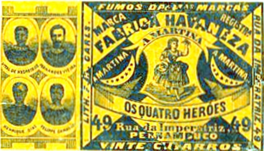 | Keywords: Rótulo de cigarro. Os Quatro Heróis.JPG Rótulo de cigarro Os Quatro Heróis Vidal de Negreiros Fernandes Vieira Henrique Dias Felipe Camarão Fundação Joaquim Nabuco http //www dominiopublico gov br/pesquisa/DetalheObraForm do select_action co_obra 21551 Litografia F H Carls A coleção Brito Alves é composta de 1 252 rótulos de cigarros na técnica litográfica Foi iniciada pelo comerciante Vicente de Brito Alves e continuada pelo seu filho o advogado pernambucano José de Brito Alves 1887-1963 Em 1964 a coleção foi doada pela família ao então Instituto Joaquim Nabuco de Pesquisas Sociais Constitui-se em um raro e valioso patrimônio cultural e artístico registrando fatos históricos usos costumes e aspectos da vida cultural da sociedade brasileira e particularmente da pernambucana no final do século XIX até as primeiras décadas do século XX PD-old João Fernandes Vieira André Vidal de Negreiros António Filipe Camarão Henrique Dias Cigarette cards |