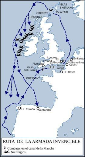 | Keywords: Routes of the Spanish Armada-es.svg Map of the route taken by the Spanish Armada Source http //www dean usma edu/history/web03/atlases/dawn_modern_warfare/dawn 20modern 20warfare 20maps/routes_armada gif History Department of the United States Military Academy at West Point Routes_of_the_Spanish_Armada gif 2008-10-20 13 10 UTC derivative work RedTony <big> </big> Routes_of_the_Spanish_Armada gif Frank Martini Cartographer History Department US Military Academy 100px English original version 100px Classical Chinese translation 100px German translation 100px French translation PD-USGov original upload log This image is a derivative work of the following images Image Routes_of_the_Spanish_Armada gif licensed with PD-USGov 2006-01-18T14 23 28Z Kooma 415x756 28155 Bytes <nowiki> Summary Map of the route taken by the Spanish Armada Source http //www dean usma edu/history/atlases/dawn_modern_warfare/routes_armada html History Department of the United States Military Academy at West Point </nowiki> Uploaded with derivativeFX Maps of the history of Spain Maps of the history of the United Kingdom Maps of voyages |