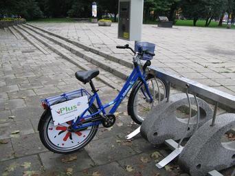 Keywords: Rower BikeOne Kraków 2009.jpg en One of the bikes used in bicycle sharing system in Crakow pl Jeden z rowerów należących do systemu automatycznych wypożyczlani BikeOne Kraków own Motilla 2009-08-29 KMK Bike Bicycle racks in Kraków