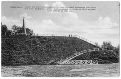 | Keywords: Royal Bastion and monument Sofia Regiment.jpg en Sofia Regiment Monument at the Royal Bastion Bottom view of the bastion ru Памятник Софийскому полку на Ко олевском бастионе Вид снизу бастиона О игинальная отк ытка е установлена before 1917 года PD-RusEmpire 20th-century postcards Postcards of Smolensk Historical photos of Monument to Sofijsky regiment |