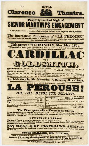 Keywords: text monochrome writing Arrangements of text, with different sizes of lettering. Cast of "La Perouse" included: Mr J Parry, Mr Nunn, Mr Gray, Mr Pugh, Mr Clifton, Mr Jones, Mr Walton, Signor Martini (as the Ch[i]mpanzee), Mr Wantwit, Mrs J Parry, Miss Grossette, Miss E Smith. Synopsis of "La Perouse" is given thus: "The piece opens with a tremendous storm. Perouse seen swimming from the wreck and reaches the Island - is alarmed at the appearance of a great bear and champanzee [chimpanzee] - interior view of a grotto - a calm sea - the interior of the island - icebergs and frozen lake - exterior of Perouse's hut. Natives at a repast - they observe Perouse, he enters; the natives rush out and prepare to destroy him; Umba prevents them and becomes enamoured of Perouse; Kanko is jealous; Perouse is wounded by a poisoned arrow from Kanko; Ch[i]mpanzee sucks the wound and he recovers. Sea scene - ship L'Esperance arrives. Madame Perouse and her son from France in search of her husband; she discovers an inscription, which informs her of his fate". Inscriptions: Inscribed - Verso - bottom left: Webster Collection 2955. Quantity: 1 b&w art print(s). Physical Description: Letterpress, 320 x 192 mm. Peck & Smith (Firm). Royal Clarence Theatre :Positively the last night of Signor Martini's engagement ... the interesting pantomime of "La Perouse" ... this present Wednesday, May 14th, 1834 ... "Cardillac the goldsmith" ... an Irish song by Mr Macarthy. A dance by Mrs Clifton. The whole to conclude with the grand serious pantomime of "La Perouse! or, The desolate island". The piece opens with a tremendous storm ... natives at a repast ... Peck & Smith, printers and stationers, 38 Lowgate, Hull [1834]. [Collection of ephemera, handbills, fliers, collected by Kenneth Athol Webster. 1800-1920]. Ref: Eph-B-WEBSTER-Theatre-1834-01. Alexander Turnbull Library, Wellington, New Zealand. natlib.govt.nz/records/22709165 Arrangements of text, with different sizes of lettering. Cast of "La Perouse" included: Mr J Parry, Mr Nunn, Mr Gray, Mr Pugh, Mr Clifton, Mr Jones, Mr Walton, Signor Martini (as the Ch[i]mpanzee), Mr Wantwit, Mrs J Parry, Miss Grossette, Miss E Smith. Synopsis of "La Perouse" is given thus: "The piece opens with a tremendous storm. Perouse seen swimming from the wreck and reaches the Island - is alarmed at the appearance of a great bear and champanzee [chimpanzee] - interior view of a grotto - a calm sea - the interior of the island - icebergs and frozen lake - exterior of Perouse's hut. Natives at a repast - they observe Perouse, he enters; the natives rush out and prepare to destroy him; Umba prevents them and becomes enamoured of Perouse; Kanko is jealous; Perouse is wounded by a poisoned arrow from Kanko; Ch[i]mpanzee sucks the wound and he recovers. Sea scene - ship L'Esperance arrives. Madame Perouse and her son from France in search of her husband; she discovers an inscription, which informs her of his fate". Inscriptions: Inscribed - Verso - bottom left: Webster Collection 2955. Quantity: 1 b&w art print(s). Physical Description: Letterpress, 320 x 192 mm. Peck & Smith (Firm). Royal Clarence Theatre :Positively the last night of Signor Martini's engagement ... the interesting pantomime of "La Perouse" ... this present Wednesday, May 14th, 1834 ... "Cardillac the goldsmith" ... an Irish song by Mr Macarthy. A dance by Mrs Clifton. The whole to conclude with the grand serious pantomime of "La Perouse! or, The desolate island". The piece opens with a tremendous storm ... natives at a repast ... Peck & Smith, printers and stationers, 38 Lowgate, Hull [1834]. [Collection of ephemera, handbills, fliers, collected by Kenneth Athol Webster. 1800-1920]. Ref: Eph-B-WEBSTER-Theatre-1834-01. Alexander Turnbull Library, Wellington, New Zealand. natlib.govt.nz/records/22709165 |