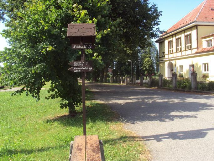 Keywords: Rozcestník před Valdštejskou alejí.JPG cs Rozcestník v Zahrádkách u soch školy a aleje own Zákupák 2013-07-07 Valdštejnská alej Zahrádky u České Lípy Hiking and footpath fingerposts in Zahrádky