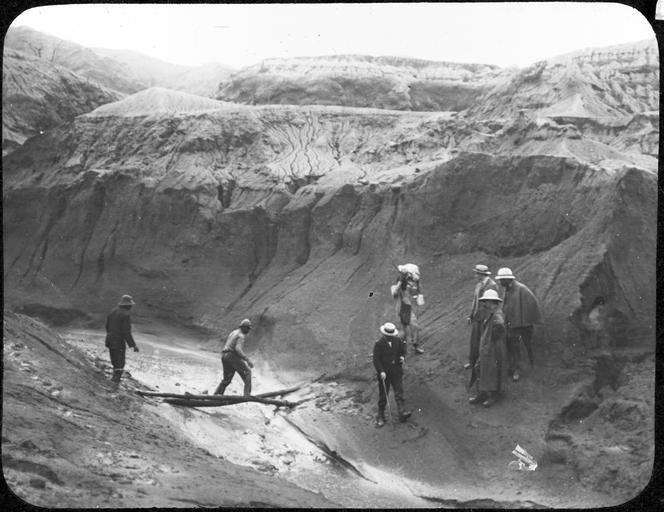 | Keywords: Rozeau Dry River. Boiling mud. YORYM-TA0098.jpg Three slides one negative and one print Man crossing bridge of tree trunks across river of boiling mud River has eroded a gorge in ash deposits Seven male figures can be seen They appear to be equiped for wet weather capes hats and umbrellas The man second from right is probably J S Flett depicted people Possibly John Flett depicted place Rozeau Saint Vincent 1902 Black and White glass Lantern slide Institution Yorkshire Museum Natural History object history exhibition history credit line Yorkshire Museum York Museums Trust accession number YORYM TA98 The Tempest Anderson Photographic Archive held at York Museums Trust <br> York Museums Trust image PD-old-100 PD-US Uploaded with UploadWizard Images from the Tempest Anderson Collection vulcanology |