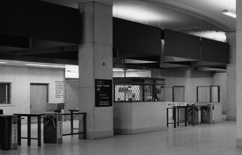 | Keywords: RTA Red Line Public Square Station Second Entrance.jpg Secondary entrance of RTA Red Line Rapid Transit station in Cleveland Union Terminal in Cleveland Ohio 1980s HAER OHIO 18-CLEV 45-120 Cleveland in the 1980s Tower City “Public Square RTA Rapid Transit station |
