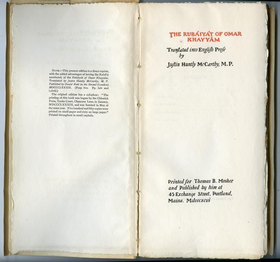 | Keywords: Rubaiyat-Thomas-Mosher-1896-Title-Page.JPG en Title-page of the Rubaiyat of Omar Khayyam printed by Thomas Mosher in 1896 ru Титульный лист книги Рубаи Ома а Хайяма напечатанной Томасом оше ом в 1896 году Rubaiyat of Omar Khayyam Thomas B Mosher Portland 1896 Thomas Mosher 1896 1896 books Cc-zero |