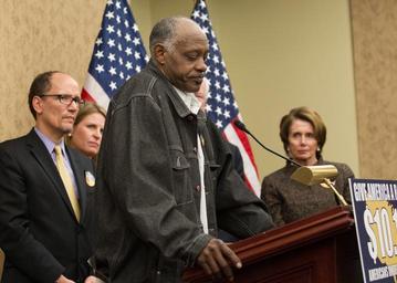 Keywords: Ruben Jones speaks about minimum wage in the US, 2014 (1).jpg Ruben Jones full time cook at the Golden Coral Restaurant a low-wage worker who spoke about his struggles to make ends meet working minumum wage jobs during a stop of the 'Give America a Raise' bus tour at the U S Capitol Building on April 3 2014 in Washington DC 3 April 2014 -Washington DC - Secretary of Labor Thomas Perez gives remarks at the Americans United for Change Bus Tour Stop at the U S Capitol On hand for the event was Harry Reid Senate Majority Leader U S Senate; Nancy Pelosi Minority Leader U S House of Representatives; Senator Tom Harkin; Representative George Miller; Senator Al Franken Lee Saunders AFSCME President; Liz Shuler AFL-CIO Secretary-Treasurer; Ruben Jones full time cook at the Golden Coral Restaurant; Anna Hovland Tipped server at two local DC Restaurants; and Gina Schaefer Owner of 9 Ace Hardware stores in DC and Maryland Official Department of Labor Photograph This official Department of Labor photograph is being made available only for publication by news organizations and/or for personal use printing by the subject s of the photograph The photograph may not be manipulated in any way and may not be used in commercial or political materials advertisements emails products and/or promotions that in any way suggest approval or endorsement of the Secretary or the Department of Labor Photo Credit Department of Labor https //www flickr com/photos/usdol/13608832013/ AF8E1607 2014-04-03 11 34 https //www flickr com/people/52862363 N07 US Department of Labor PD-USGov US Department of Labor https //flickr com/photos/52862363 N07/13608832013 2016-09-06 06 57 12 United States Government Work Thomas Perez in 2014 Liz Shuler Ruben Jones Nancy Pelosi in 2014 |