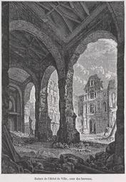| Keywords: Ruines de l'Hôtel de Ville, cour des bureaux.jpg Artwork This print shows several archways of an office building once part of the Hôtel de Ville in ruins Such destruction of public property associated with the government of the Second Empire was not uncommon during the Commune's siege of Paris 1875-1882 lithograph 16 2 x 11 4 cm Institution Brown University Library object history exhibition history credit line Published in Theodor Josef Hubert Hoffbauer Paris à travers les âges Paris Firmin-Didot et cie 1885 accession number 1163692313421875 PD-old Lithographs of Paris Images of Paris from the Brown University Library Paris à travers les âges Historical images of Hôtel de Ville de Paris Ruins in Paris |
