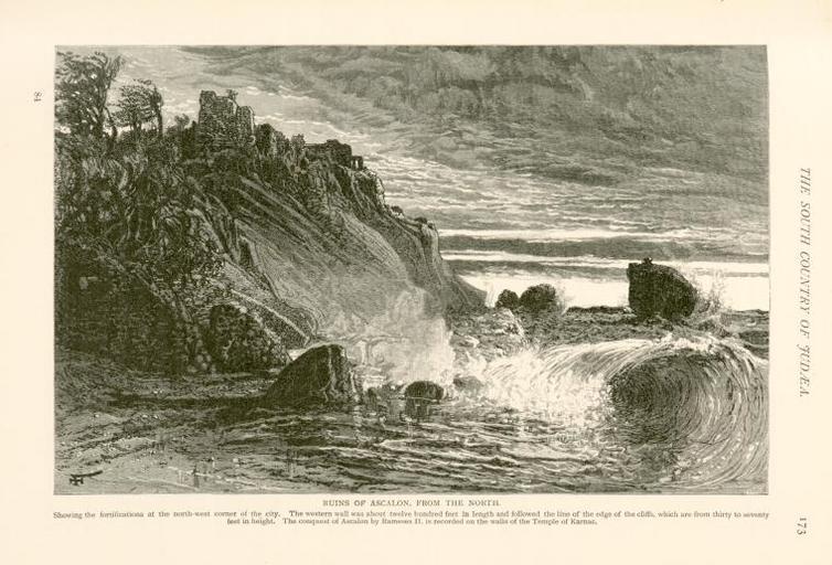 | Keywords: Ruins of Ashkelon (1881-1884). The conquest of Ascalon by Rameses II is recorded on the walls of the Temple of Karnac.jpg Ruins of Ashkelon from the North Showing fortifications at the north-west corner of the city The western wall was about twelve hundred feet in length and followed the lines of the edge of the cliffs which are from thirty to seventy feet in height The conquest of Ascalon by Rameses II is recorded on the walls of the Temple of Karnac 110765 1881-1884 Harry Fenn PD-100 Harry Fenn Picturesque Palestine Sinai and Egypt Historical images of Ashkelon |