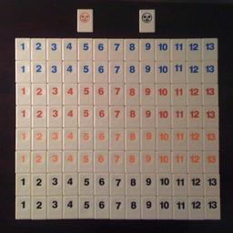 | Keywords: RummikubTiles.jpg  en Rummikub's 106 tiles consisting of 104 number tiles and two joker tiles The number tiles range in value from one to thirteen in four colors black yellow blue and red Each combination of color and number is represented twice Own BrianBarney 2008-11-05 40 43 69 0 N 74 0 18 0 W source exif_heading Rummikub |