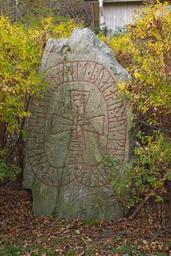 Keywords: sweden haninge västerhaninge runsten stav geotagged runestone runor runes sverige outdoor Lite gömd i en häck i byn Stav så står det en runsten med en enkel slinga som börjar och slutar i ett kors. Runraden lyder "+ auþa + raisti + stain : at : haralt . buata . sin : auk . fastlauk . at + faþur sin" Det finns ingen skylt på platsen och min översättning lyder, "Autha reste stenen efter Harald, buata? sin och Fastlauk efter sin fader". Buata sägs betyda bonde eller husbonde, en annan sak som man skall notera är hur ofta runristaren har bytt avskiljningstecken mellan orden och att runraden delar ett avskiljningstecken där runraden börjar. Korset är typiskt för Amunde och även självaste tekniken liknar Amunde som jag skulle nog gissa att det är Amunde som ristat denna sten. (RAÄ Västerhaninge 7:1) Lite gömd i en häck i byn Stav så står det en runsten med en enkel slinga som börjar och slutar i ett kors. Runraden lyder "+ auþa + raisti + stain : at : haralt . buata . sin : auk . fastlauk . at + faþur sin" Det finns ingen skylt på platsen och min översättning lyder, "Autha reste stenen efter Harald, buata? sin och Fastlauk efter sin fader". Buata sägs betyda bonde eller husbonde, en annan sak som man skall notera är hur ofta runristaren har bytt avskiljningstecken mellan orden och att runraden delar ett avskiljningstecken där runraden börjar. Korset är typiskt för Amunde och även självaste tekniken liknar Amunde som jag skulle nog gissa att det är Amunde som ristat denna sten. (RAÄ Västerhaninge 7:1)