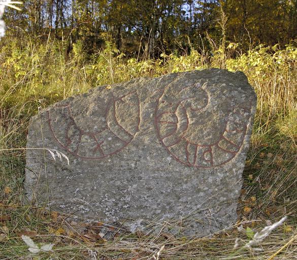 | Keywords: sweden haninge österhaninge kyrkogård runsten runestone runor runes runfragment fragment geotagged herrhagen åker sverige outdoor I en skogsdunge på en åker som jag tror heter "Lundby gärden" i närheten av Österhaninges nya begravningsplats, så står nedre delen av en runsten. Det ända man kan utläsa av runraden är: "...kar : (l)... ... bruþru : .. ...þa..."., och skall man försöka översätta detta så är det ända ord man med (relativ) säkerhet kan utläsa "broder". Runt om stenen finns det flera stenbitar som kan tänkas tillhöra denna sten och jag tror att man kanske kan hitta fler bitar om man kanske letade omkring lite i jorden runt detta område. (RAÄ Österhaninge 412:1) I en skogsdunge på en åker som jag tror heter "Lundby gärden" i närheten av Österhaninges nya begravningsplats, så står nedre delen av en runsten. Det ända man kan utläsa av runraden är: "...kar : (l)... ... bruþru : .. ...þa..."., och skall man försöka översätta detta så är det ända ord man med (relativ) säkerhet kan utläsa "broder". Runt om stenen finns det flera stenbitar som kan tänkas tillhöra denna sten och jag tror att man kanske kan hitta fler bitar om man kanske letade omkring lite i jorden runt detta område. (RAÄ Österhaninge 412:1) |