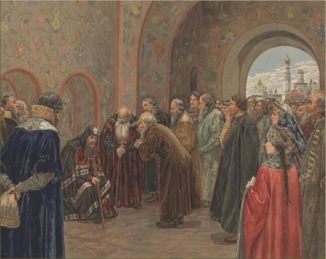 | Keywords: Rupture of patriarch Nikon with tsar Aleksey Mihajlovich.jpeg Rupture of patriarch Nikon with tsar Aleksey Mihajlovich Раз ыв пат иа ха икона с ца ем Алексем ихайловичем http //chron eduhmao ru/img_7_12_0_2 html end of XIX c Sergey Miloradovich 1851 1943 PD-Russia-2008 Patriarch Nikon in history paintings Sergey Miloradovich |