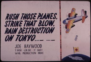 | Keywords: Rush those planes. Strike that blow. Rain destruction on Tokyo. - NARA - 534740.tif  Scope and content General notes 534740 Local identifier 179-WP-889 Office for Emergency Management War Production Board 01/1942 - 11/03/1945 Still Picture Records Section Special Media Archives Services Division NWCS-S National Archives at College Park 8601 Adelphi Road College Park MD 20740-6001 other date circa 1942 1943 Record group Record Group 179 Records of the War Production Board 1918 - 1947 Record group ARC 508 War Production Board compiled 1942 - 1943 Series ARC 533858 File unit File unit ARC Variant control numbers NAIL Control Number NWDNS-179-WP-889 yes Other versions <gallery> File Rush_those_planes _Strike_that_blow _Rain_destruction_on_Tokyo _-_NARA_-_534740 tif tif File Rush_those_planes _Strike_that_blow _Rain_destruction_on_Tokyo _-_NARA_-_534740 jpg jpg </gallery> NARA-cooperation PD-USGov World War II posters from the United States NARA TIF images with categorized JPGs |