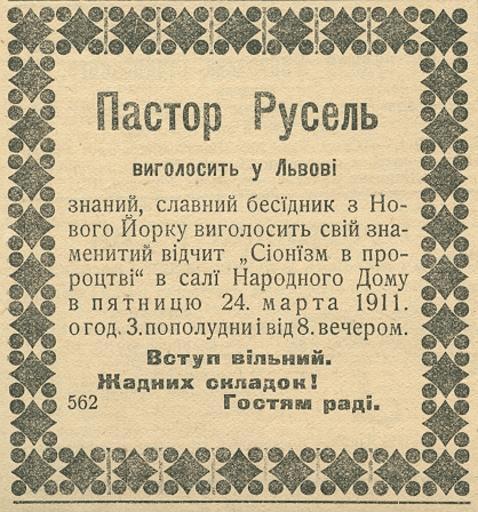 Keywords: Russell-Dilo-1911-03.jpg uk ви ізка з львівської газети Діло за бе езень 1911 оку в якій гово илось п о пибуття пасто а Рассела до Львова з біблійною п омовою pl Zapowiedź wykładu Charlesa Russella we Lwowie w dniu 24 marca 1911 oryginalnie załadowany na uk wiki - Геннадій Самолюк en Charles Taze Russell in Lwow 1911-24-03 Газета Діло 24 бе езня 1911 оку сто 8 gazeta Діло Lwów 24 marca 1911 No 66 str 8 1911-03 newspaper Dilo PD-Old Charles Taze Russell |