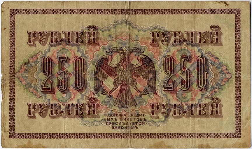 | Keywords: Russia-1917-Banknote-250-Reverse.png Provisional Government of Russia banknote 1917 250 rubles reverse Госуда ственный к едитный билет В еменного п авительства России 1917 год 250 ублей об атная сто она own <br /> Banknote is courtesy of collector who wants to remain anonymous Thank you Банкнота п едоставлена коллекционе ом пожелавшим остаться анонимным Спасибо 1917 Provisional Government of Russia PD-RusEmpire PD-old currency Banknotes of Russia 1917 Banknotes with a face value of 250 Swastikas on banknotes |