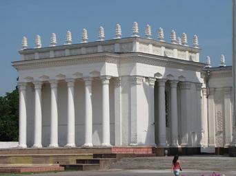 Keywords: russia building urban columns architecture sky clouds outside trees woman steps