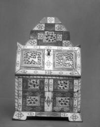 Keywords: Russian - Desk with Animals and Decoration - Walters 71429.jpg This seven-drawer miniature writing desk is known as a teremok small tower cabinet Flat walrus-ivory and bone plaques some of which have been stained moss green are affixed by nails to the cabinet's front and sides and to the fronts of the three interior drawers Their surface is busily decorated with circle motifs and colored black Twelve thicker plaques carved with rocaille floral openwork decoration typical of the mid 18th century north Russian School have been set over mica sheets on the exterior drawer fronts sides and top The two largest of these plaques are set into the sloping drop-front They include on the right a lion and on the left a doe and swooping bird within the stylized floral matrix Several of the plaques are chipped or cracked On the back on a paper tag is written 130; engraved on the bottom of the left front foot is the date 1812 early Other date century 19 wood walrus ivory and bone cm 29 5 25 11 accession number 71 429 5269 Scandinavia William T / Henry Walters Collection Baltimore date of acquisition unknown by purchase Walters Art Museum Henry Walters Acquired by William T or Henry Walters Number On the back on a paper tag 130; Date Engraved on the bottom of the left front foot 1812 Russian Art Icons and Decorative Arts from the Origin to the Twentieth Century The Walters Art Gallery Baltimore 1959-1960 A Millennium of Christianity Russian Art from The Walters Art Gallery The Walters Art Gallery Baltimore 1988-1989 place of origin north Russia Walters Art Museum license Slant-front desks Ivory objects Walrus ivory 19th-century furniture desks Decorative and applied arts of Russia Furniture in the Walters Art Museum Writing desks