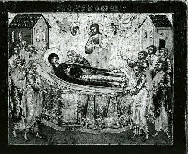 | Keywords: Russian - Dormition (Death) of the Virgin - Walters 372390.jpg The Virgin lies on her funereal bier with the disciples gathered around her John to whom Christ specially entrusted his mother John 19 27-28 leans close by her head with Christ standing behind him holding her soul represented as a child in swaddling clothes Two angels wait to receive the soul from Christ's arms The two houses in the background represent Jerusalem by tradition the location of the Dormition and also a reminder of the symbolism of Mary as the representation of the Church the new Temple of Jerusalem The door painted on the Virgin's bier is an unusual detail of unclear significance The icon's style resembles that of the last generation of icon painters of the Moscow Armory just before the center of state-supported art moved to the new capital of St Petersburg century 18 Early Modern tempera wood cm 31 6 40 2 accession number 37 2390 24162 Lilian Halsey Barker Mrs Lewellys F Barker Baltimore date of acquisition unknown by purchase Walters Art Museum January 1961 by bequest Bequest of Lilian Halsey Barker 1961 place of origin Russia Walters Art Museum license 2D Russian art in the Walters Art Museum Religious art in Russia Art of the Russian Orthodox Church Russian icons in the Walters Art Museum Media contributed by the Walters Art Museum needs category review |