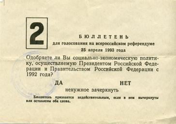 Keywords: Russian government referendum2, 1993.jpg en Voting bulletin at Russian government referendum 1993 Question 2 ru Бюллетень для голосования на Все оссийском ефе ендуме 25 ап еля 1993 года Воп ос 2 http //lori ru/581073 Russian Federation 1993 PD-RU-exempt Referendums in 1993 |