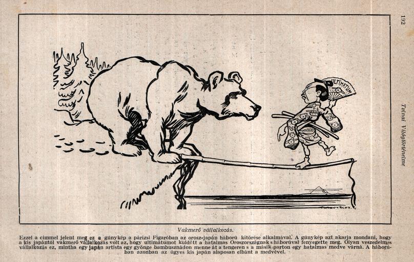| Keywords: Russian-Japan bear-bambus.jpg en English and Hungarian This is the title of this ironically image appeared in the Parisian Figaro in occasion of the outbreak of the Russo-Japanese war The mock image is trying to say that small Japan was a bold undertaking sent an ultimatum to strong Russia and with war threatened It's one so a dangerous business as if it is a Japanese artist a weak bamboo would go over the sea and on the other side would a huge bear waiting him During the war however the clever little Japan thoroughly handled with the bear Magyar Vakmerő vállalkozás Ezzel a címmel jelent meg ez a gúnykép a párizsi Figaróban az orosz-japán kitörése alkalmával A gúnykép azt akarja mondani hogy a kis Japántól vakmerő vállalkozás volt az hogy ultimátumot küldött a hatalmas Oroszországnak s háborúval fenyegette meg Olyan veszedelmes vállalkozás ez mintha egy japán artista egy gyönge bambusznádon menne át a tengeren s a másik parton egy hatalmas medve várná A háborúban azonban az ügyes kis japán alaposan elbánt a medvével Tolnai világtörténelme VII rész A legujabb kor 20-Napjaink története Tolnai nyomdai műintézet és kiadóvállalat R -T kiadása Budapest published round 1920 page 192 Ballagi Aladár and 14-co-authors 1904 it appeared 1904 before more as 100 years so is in public domain PD-Old Russo-Japanese War in 1904 Russian Bear cc-by-3 0 |