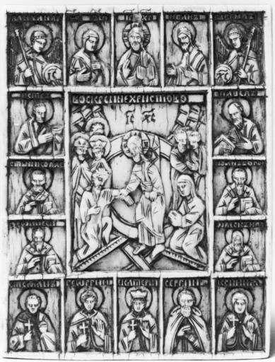 Keywords: Russian - Resurrection of Christ - Walters 71260.jpg The center of this plaque shows the Anastasis Resurrection with Christ standing on the broken gates of hell and pulling Adam up from below as a sign that the Original Sin has been redeemed A kneeling Eve and other Old Testament figures wait to be saved Above Christ is shown as lord of the universe flanked by the Virgin Saint John the Baptist and the archangels Michael and Gabriel who pray to him for the salvation of humankind Below from left to right are the apostles Peter and Paul Saints Nicholas and Gregory the Theologian wrongly named John the Theologian in the accompanying inscription Dionysius the Areopagite and Alexis Metropolitan of Moscow Stephen George Catherine Sergius of Radonezh and Xenia The back of the plaque carries an image of the instruments of Christ's passion the Cross Crown of Thorns Lance and Reed with vinegar-soaked sponge century 16 17 Early Modern ivory cm 7 8 5 9 0 6 accession number 71 260 10633 Henry Walters Baltimore date of acquisition unknown by purchase Walters Art Museum Henry Walters Acquired by Henry Walters Translation on the back The King of Glory Jesus Christ conquers The Place of a Skull became Paradise A Millennium of Christianity Russian Art from The Walters Art Gallery The Walters Art Gallery Baltimore 1988-1989 place of origin central Russia Walters Art Museum license Russian art in the Walters Art Museum Religious art in Russia Art of the Russian Orthodox Church Media contributed by the Walters Art Museum needs category review |