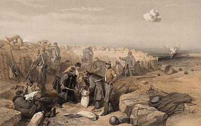 Keywords: Russian rifle pit - now part of the British advanced trenches.jpg Artwork en Print shows soldiers filling sand bags and firing over a barrier of sand bags and gabions W Simpson; C Haghe lith 38 4 x 57 1 print lithograph tinted accession number LC-DIG-ppmsca-05700 digital file from original print Institution Library of Congress ppmsca 05700 Rights Advisory No known restrictions on publication Title from item Plate in The seat of war in the east Dedicated by permission to Her most gracious Majesty the Queen / William Simpson First series London Published by Paul Dominic Colnaghi Co publishers to Her Majesty 13 14 Pall Mall East ; Paris Goupil Cie 1855 plate 37 Colnaghis' authentic series PD-100 William Simpson Uploaded with UploadWizard |