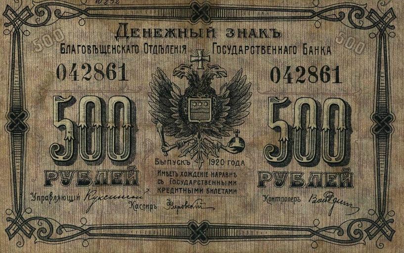 Keywords: RussiaPS1259B-500Rubles-1920-donatedta f.jpg 500 ублей Денежный знак Благовещенского отделения Госбанка 1920 года Аве с выпускало отделение Госбанка России п и атамане Семёнове 1920 http //www banknoteworld com/notedir/mappage html 1920 currency Original upload log ru wikipedia ftcg page ru wikipedia RussiaPS1259B-500Rubles-1920-donatedta_f jpg wikitable - 17 08 9 October 2007 850 × 533 193 559 bytes Vizu w ru <nowiki> Описание Авто В емя создания Источник </nowiki> Banknotes with a face value of 500 Money of Civil war of Russia |