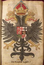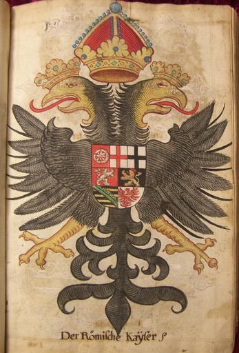 | Keywords: Rüxner Turnierbuch Abschrift 17Jh 23.jpg Um Zusätze vermehrte Abschrift von Sigmund Feyerabends Frankfurter Ausgabe 1578/1579 des Turnierbuchs von Georg Rüxner Jörg Rugen Handschrift auf Papier 17 Jahrhundert <br /><br />Detail Reichsadler mit den Wappen der sieben Kurfürsten als Herzschild http //www antiquariat-kunsthandel de century 17 anonymous PD-Art Rüxners Turnierbuch Abschrift 17 Jh Coats of arms of the Holy Roman Empire Prince-electors Coats of arms of archbishops of the Roman Catholic Diocese of Trier Coats of arms of archbishops of the Roman Catholic Archdiocese of Cologne Coats of arms of archbishops of the Roman Catholic Diocese of Mainz Coats of arms of the House of Wittelsbach Marshalled Bohemia Saxony in heraldry Coats of arms of Brandenburg |