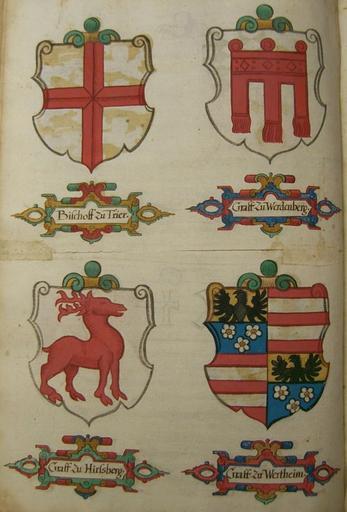 | Keywords: Rüxner Turnierbuch Abschrift 17Jh 61.jpg Um Zusätze vermehrte Abschrift von Sigmund Feyerabends Frankfurter Ausgabe 1578/1579 des Turnierbuchs von Georg Rüxner Jörg Rugen Handschrift auf Papier in zwei Bänden 17 Jahrhundert <br /><br />Detail http //www neumann-walter de via ebay de century 17 anonymous PD-Art Rüxners Turnierbuch Abschrift 17 Jh Trier See coat of arms Coats of arms of Werdenberg family Coats of arms of Wertheim family Coats of arms of families of Germany - H Hirschberg | ||||