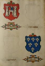 | Keywords: Rüxner Turnierbuch Abschrift 17Jh 71.jpg Um Zusätze vermehrte Abschrift von Sigmund Feyerabends Frankfurter Ausgabe 1578/1579 des Turnierbuchs von Georg Rüxner Jörg Rugen Handschrift auf Papier in zwei Bänden 17 Jahrhundert <br /><br />Detail Magdeburg Castel http //www neumann-walter de via ebay de century 17 anonymous PD-Art Rüxners Turnierbuch Abschrift 17 Jh Coats of arms of Magdeburg Coats of arms of families of Germany - C Castel | ||||