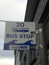 Keywords: Ryde George Street bottom bus stop flag.JPG en A bus stop flag for Wightbus route 20 at Ryde Own Editor5807 2008-10-30 Wightbus bus stops Isle of Wight bus route 20 Images by Editor5807 Bus stops in Ryde