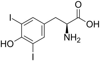 Keywords: (S)-2-amino-3-(4-hydroxy-3,5-diiodophenyl)propanoic acid 200.svg validSVG Structure of S -2-amino-3- 4-hydroxy-3 5-diiodophenyl propanoic acid Own 2014-05-02 Emeldir <span class signature-talk >talk</span> Chemical structure verified https //upload wikimedia org/wikipedia/commons/e/e8/ 28S 29-2-amino-3- 284-hydroxy-3 2C5-diiodophenyl 29propanoic_acid_200 svg 1S/C9H9I2NO3/c10-5-1-4 2-6 11 8 5 13 3-7 12 9 14 15/h1-2 7 13H 3 12H2 H 14 15 /t7-/m0/s1 NYPYHUZRZVSYKL-ZETCQYMHSA-N 300-39-0 Synonyms <small> S -2-Amino-3- 4-hydroxy-3 5-diiodophenyl propanoic acid dihydrate 3 5-Diiodo-4-hydroxy-beta-phenylalanine 3 5-Diiodo-beta- p-hydroxyphenyl -L-alanine dihydrate 3 5-Diiodo-beta- p-hydroxyphenyl alanine 3 5-Diiodo-L-tyrosine 3 5-diiodo-L-tyrosine 3 5-Diiodo-L-tyrosine dehydrate 3 5-Diiodo-l-tyrosine dihydrate 3 5-Diiodo-L-tyrosine dihydrate 3 5-Diiodo-L-tyrosine hydrate 3 5-Diiodotyrocine 3 5-Diiodotyrosine 3 5-Iodo-L-tyrosine 3 5-L-Diiodotyrosine Agontan DIIODO-L-TYROSINE Dityrin H-3 5-Diiodo-Tyr-OH H-D-Tyr 3 5-DiI -OH H-L-Tyr 3 5-I2 -OH H-Tyr 3 5-DiI -OH H-Tyr 3 5-I2 -OH H-Tyr 3 5-I2 -OH H2O Iodogorgoic acid L-3 5-DiioDOTyrosine L-Tyrosine 3 5-diiodo- 9CI TRYOSINE 3 5-DIIODO- Tyrosine 3 5-diiodo- L- 8CI </small> PD-chem Iodinated tyrosine derivatives |