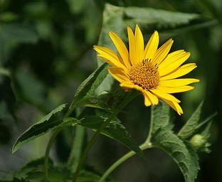 Keywords: słoneczniczek rough flower yellow garden summer flower bloom transparency single lonely the petals the interior of the blooming foliage the stem the buds flora closeup green plant dashing gentle