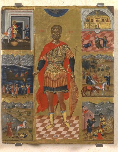 | Keywords: S.Menas by E.Lambardos (17th c.).jpg  Ο Άγιος  ηνάς με σκηνές α ό τον βίο του  ρώτες δεκαετίες 17ου αιώνα 32x39εκ Εμμανουήλ Λαμ άρδος ΧΕΙΡ Ε  Α ΟΥΗΛ ΤΟΥ ΛΑ ΠΑΡΔΟΥ Στο κέντρο εικονίζεται ο άγιος  ηνάς ως αιγύ τιος μεσήλικας στρατηλάτης Φοράει στρατιωτική ενδυμασία με  ορφυρό μανδύα κρατεί δόρυ στο δεξί χέρι και με το αριστερό την ασ ίδα του και σταυρό Αριστερά και δεξιά υ άρχουν ανά τρία εικονίδια με τα θαύματα και το μαρτύριο του αγίου σύμφωνα με τη διήγηση του Συναξαριστή http //eib xanthi ilsp gr/gr/icons asp cursort iconTitle selectFieldValue vpage 3 first decades of the 17th century Emmanuel Lambardos Emmanuel Lambardos Files uploaded by Shakko from various sources Saint Menas in icons PD-old |