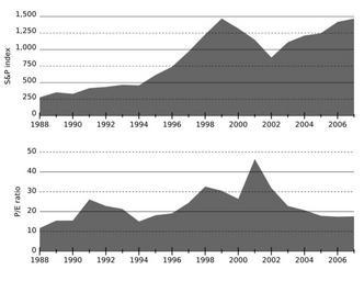 | Keywords: S&P 500 index and price-to-earnings ratios.svg Parallel graphs of the S P index and price-to-earnings ratio in the S P index for the same period own 2008-02-04 El T en wikipedia P/E_ratio Risk Market trends Stock market indexes Price-to-earnings ratio |