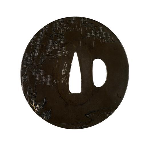 Keywords: Sadayuki - Tsuba with Chinese Generals Kanyu, Gentoku and Chohi - Walters 51340 - Back.jpg Under a pine tree at the right of this tsuba are three Chinese generals Kanyu Ch Guan Yu Kuan Yu Gentoku Ch Liu Bei Liu Pei and Chohi Ch Zhang Fei Chang Fei They fought together in the 2nd century at the beginning of the Three Kingdoms period Gentoku eventually became emperor of Shu Shu On the reverse of the tsuba is a pine tree century 18 Edo shibuichi with gold copper and gold alloys cm 6 9 accession number 51 340 17441 Henry Walters Baltimore date and mode of acquisition unknown Walters Art Museum Henry Walters Acquired by Henry Walters Signature Sadayuki kao place of origin Japan Walters Art Museum license Tsuba in the Walters Art Museum Media contributed by the Walters Art Museum needs category review Sadayuki |